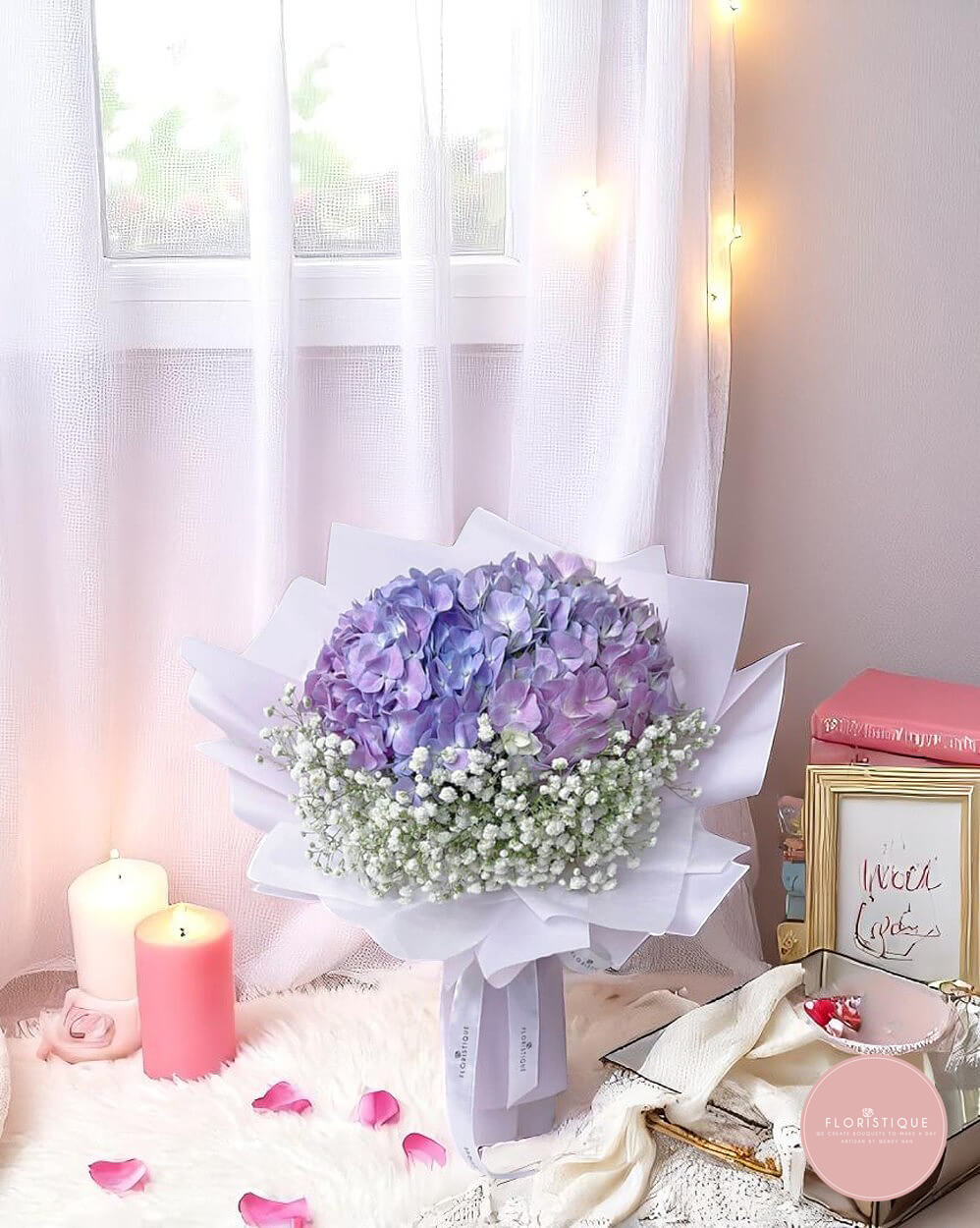 This bouquet is a poetic composition, where a dome of lavender and periwinkle hydrangeas suggests the subtle transition from spring to summer. The blooms are cradled within a lacework of pure white baby's breath, imparting a dreamy softness.