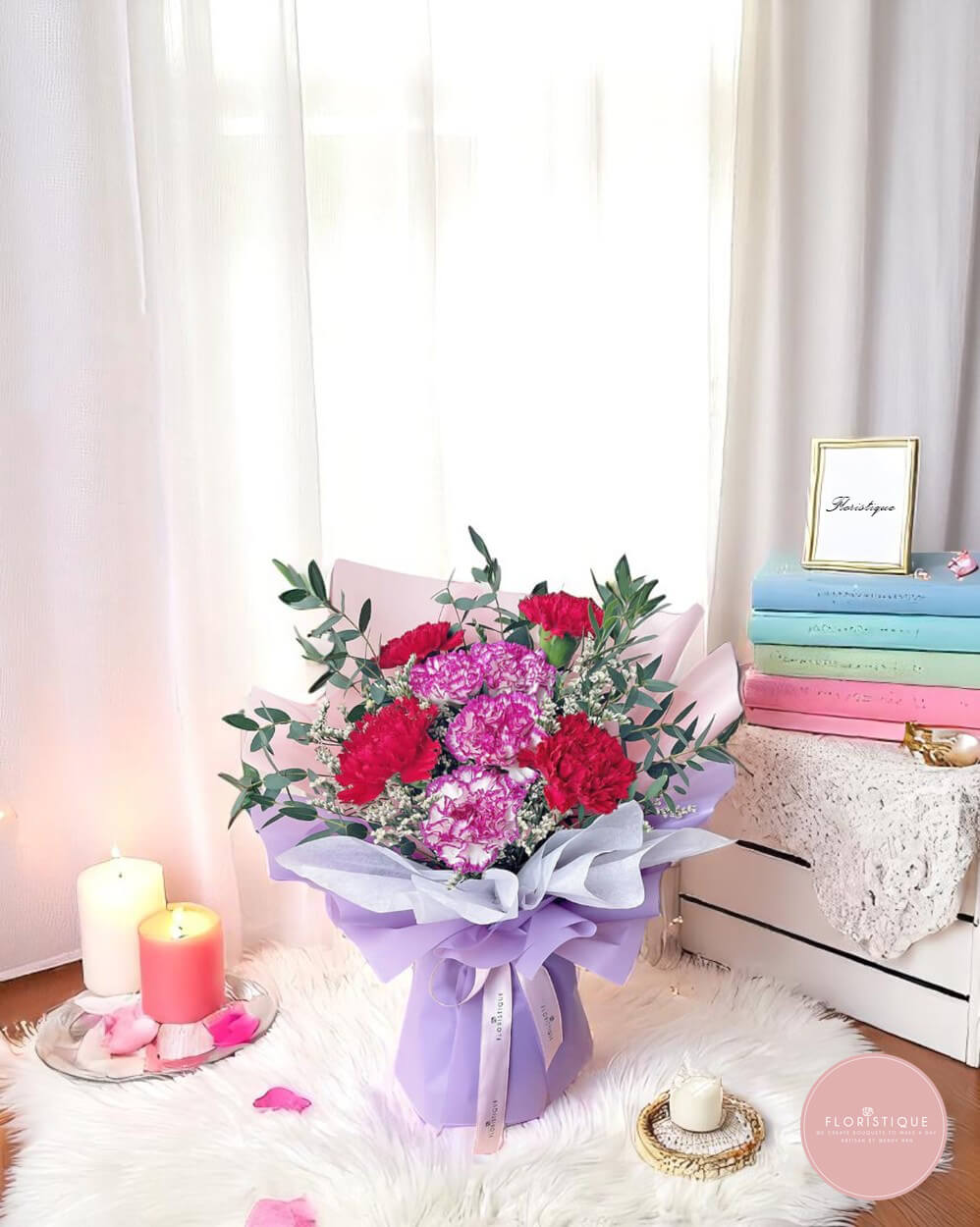 A lively fusion of bold red and patterned purple-pink carnations, accented with delicate fillers and lush greenery, this bouquet bursts with energy and heartfelt sentiment. Elegantly wrapped in lavender and blush layers and tied with a soft satin ribbon, it’s a radiant way to express appreciation and love.