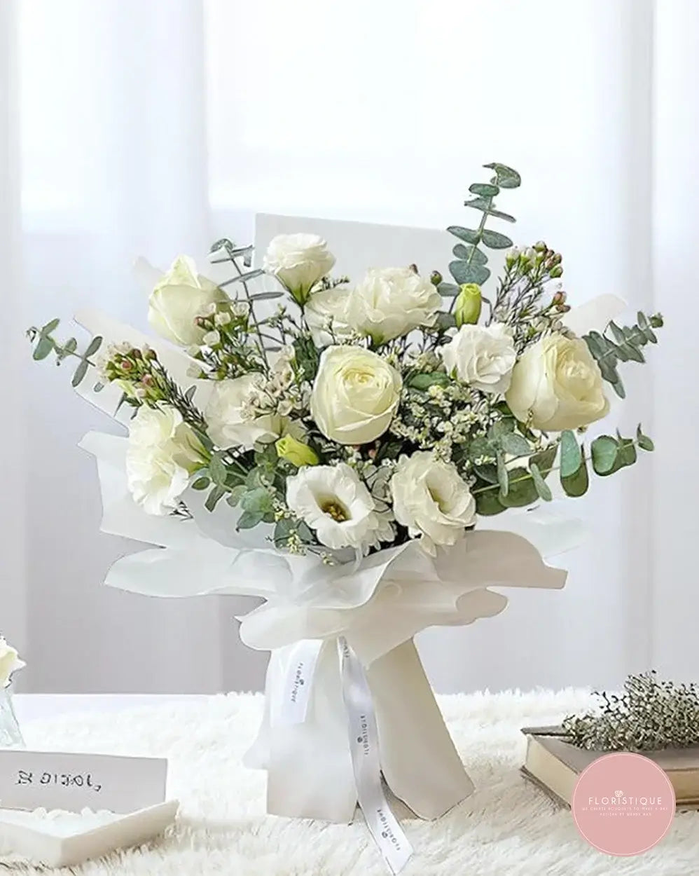 A pure and elegant bouquet featuring white roses, eustoma, and delicate baby’s breath, thoughtfully arranged with lush eucalyptus foliage. Wrapped in crisp white paper and finished with flowing satin ribbons, this serene bouquet is ideal for sympathy, remembrance, or timeless gestures of love and grace.