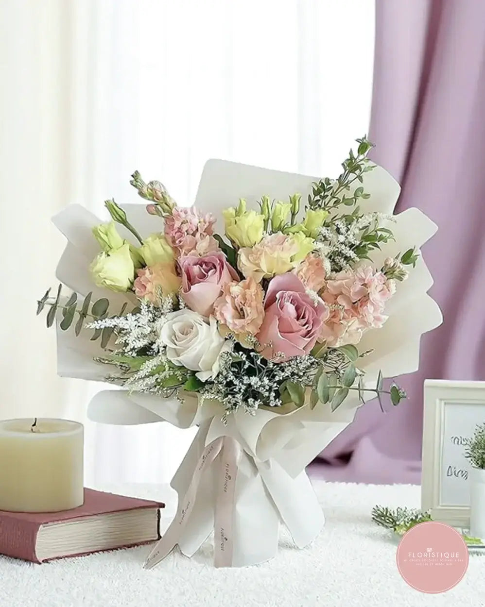 Soft and sophisticated, this bouquet showcases a dreamy blend of lavender roses, pale yellow eustoma, blush carnations, and delicate fillers, artfully arranged with eucalyptus foliage. Wrapped in clean ivory tones and tied with satin ribbon, it’s a timeless gift for birthdays, anniversaries, or to simply say “I’m thinking of you.”