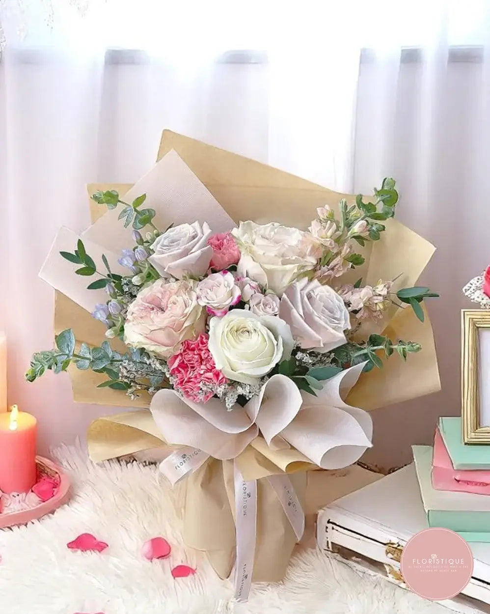 This exquisite hand-tied bouquet features creamy white roses, soft blush spray roses, and delicate pink hydrangea blooms, artfully paired with fragrant stock and silvery eucalyptus for a romantic, garden-fresh feel. Wrapped in layers of natural kraft and pastel pink paper with a graceful bow, it radiates gentle elegance—perfect for anniversaries, thank-you gifts, or simply brightening someone’s day with its serene charm.