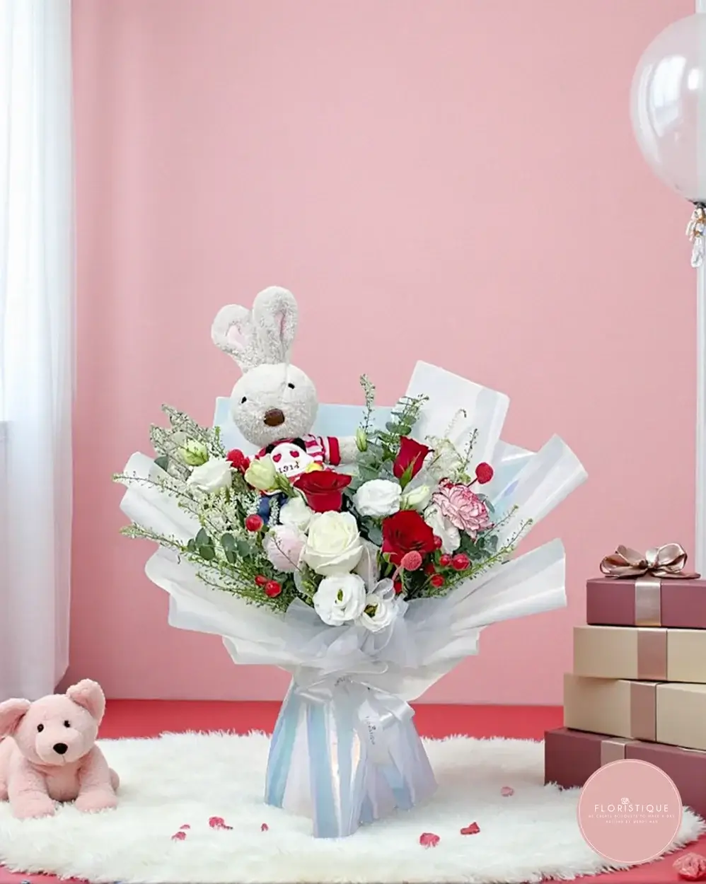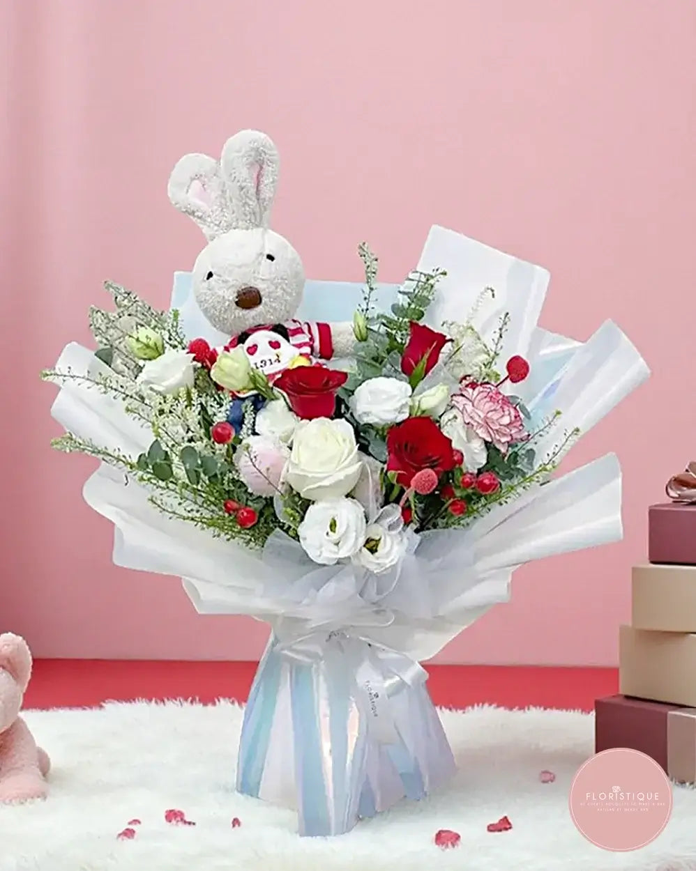 A charming blend of elegance and fun, this bouquet features a vibrant mix of red and white roses, lisianthus, carnation, and berry accents — brought to life with a soft bunny plush in a "1314" sporty striped outfit . Wrapped in shimmering pearl-toned paper and tied with delicate tulle, it’s perfect for anniversary, celebrations or anyone who deserves a big cheerful hug!