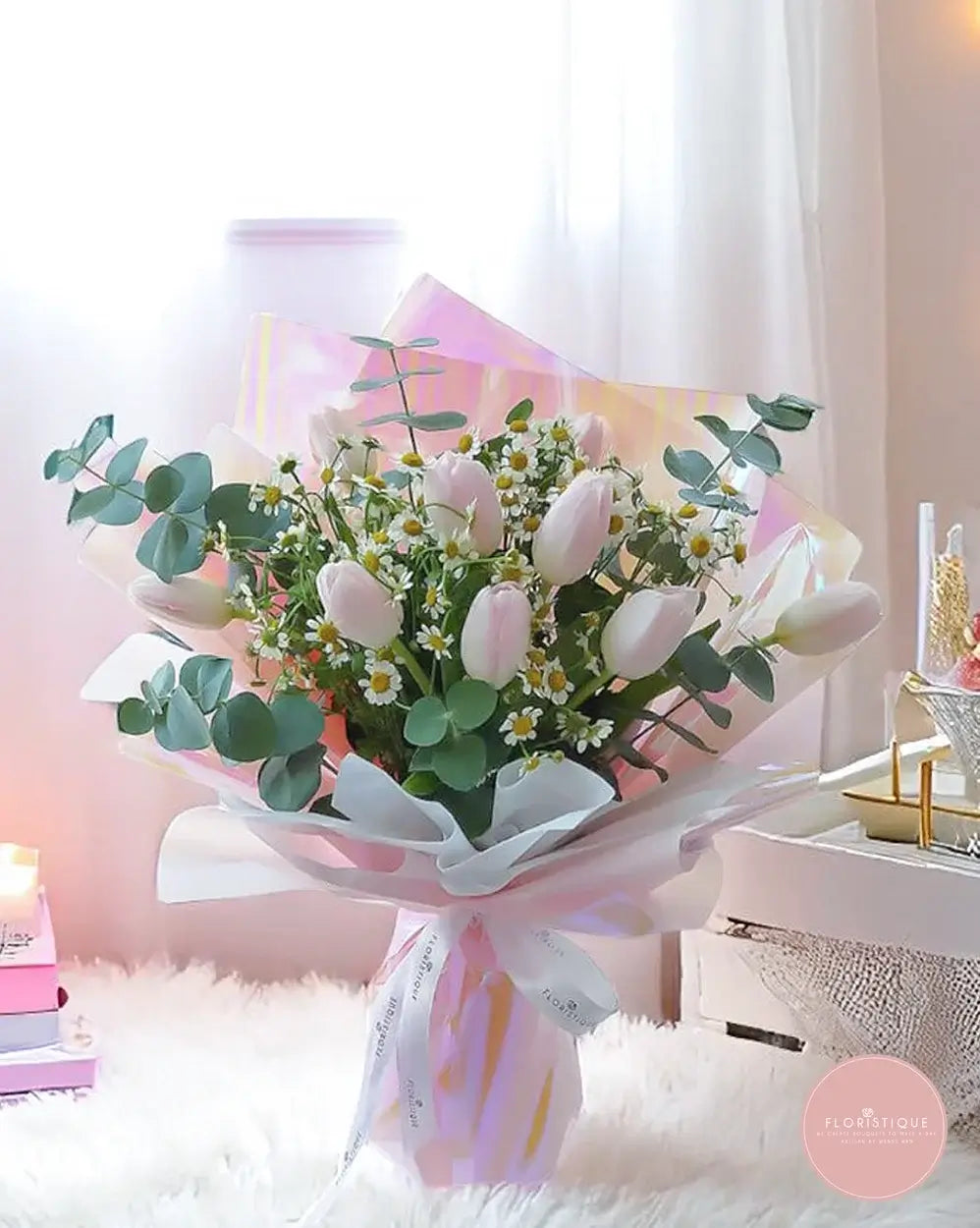 A graceful hand-tied bouquet of soft pink tulips nestled amidst dainty chamomile blooms and silvery eucalyptus, all wrapped in shimmering iridescent and pastel-hued paper. Each stem is carefully selected for its elegant form and lasting freshness, creating a tender display that captures the gentle beauty of spring—perfect for birthdays, thank-you gifts, or simply to brighten someone’s day.