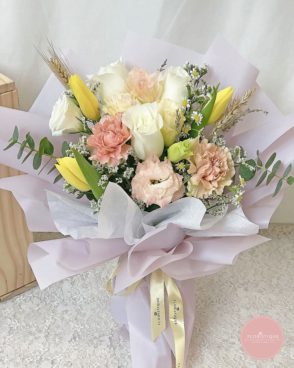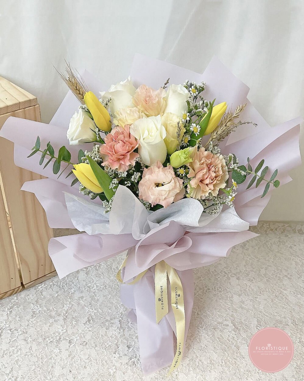 This delightful bouquet features a mix of yellow tulips, peach carnations, and white roses, creating a harmonious blend of colors. Wrapped in soft lilac paper and accented with a satin ribbon, this arrangement exudes elegance and charm, making it an ideal gift for any special occasion.
