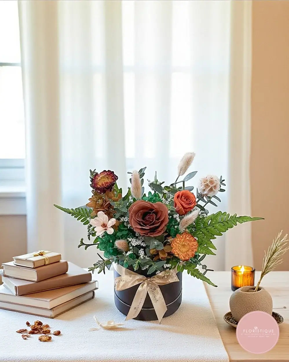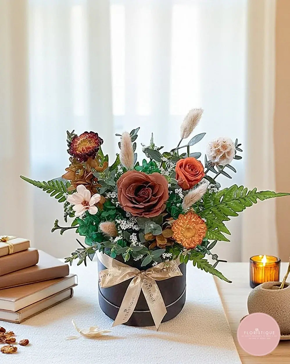 A beautifully rustic preserved hatbox arrangement featuring warm-toned preserved roses, dried blooms, ferns, and natural accents in earthy shades of brown, orange, and gold. Presented in a sleek black hatbox and finished with a satin ribbon, this design brings a touch of nature’s charm that lasts for years.