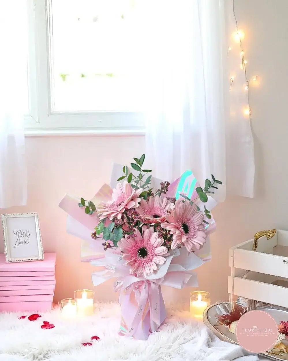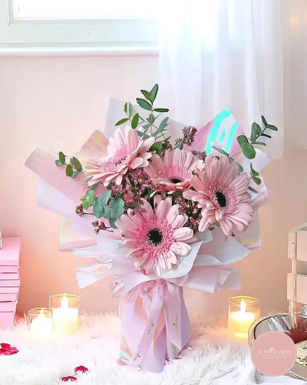 This elegant hand-tied bouquet showcases soft pink gerbera daisies arranged amidst airy waxflower sprigs and silvery eucalyptus, all artfully wrapped in iridescent pastel paper. Each bloom is carefully selected for its longevity and vibrant hue, creating a graceful display that brings warmth and joy to any space—ideal for birthdays, thank-you gifts, or simply to lift someone’s spirits.