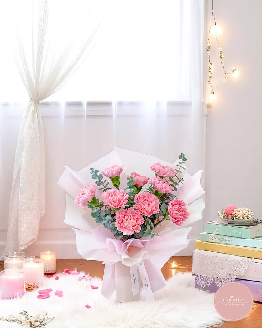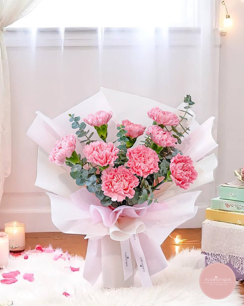 Delicate and charming, this bouquet features a lovely arrangement of soft pink carnations paired with fresh eucalyptus for a modern touch. Wrapped in pastel pink and white layers with a satin ribbon, it radiates gentle affection and timeless beauty.
