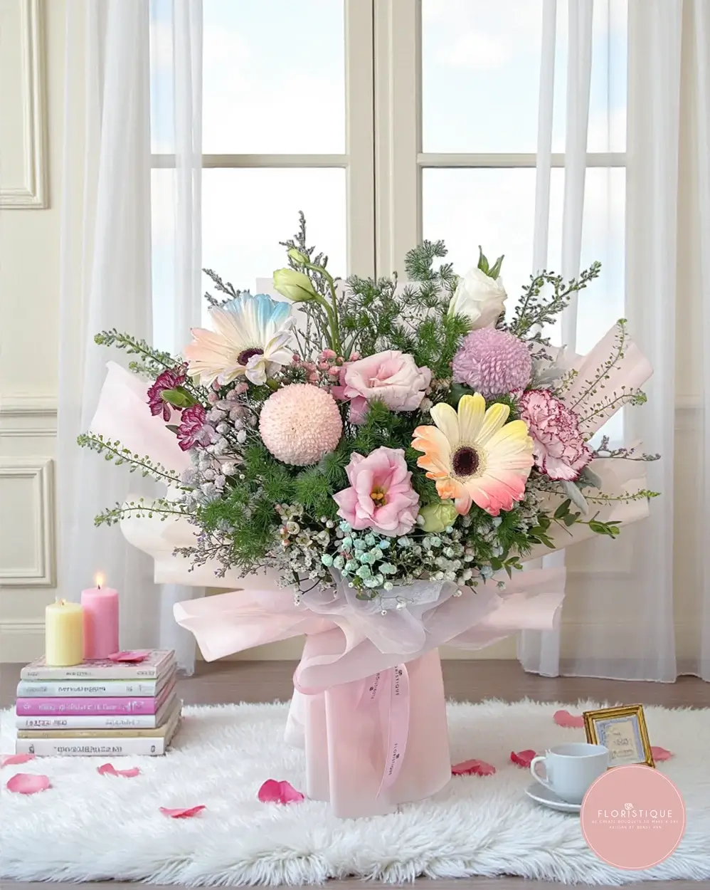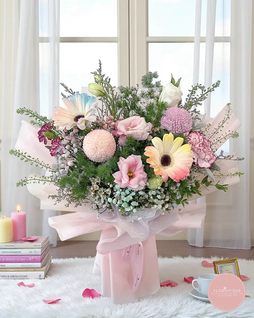 Soft, romantic and oh-so-dreamy, this bouquet brings together pastel gerberas, ping pong chrysanthemums, lisianthus, carnations and delicate filler blooms nestled in airy greenery. Wrapped in layers of blush pink organza, it has a whimsical, cotton-candy charm that instantly brightens any space.