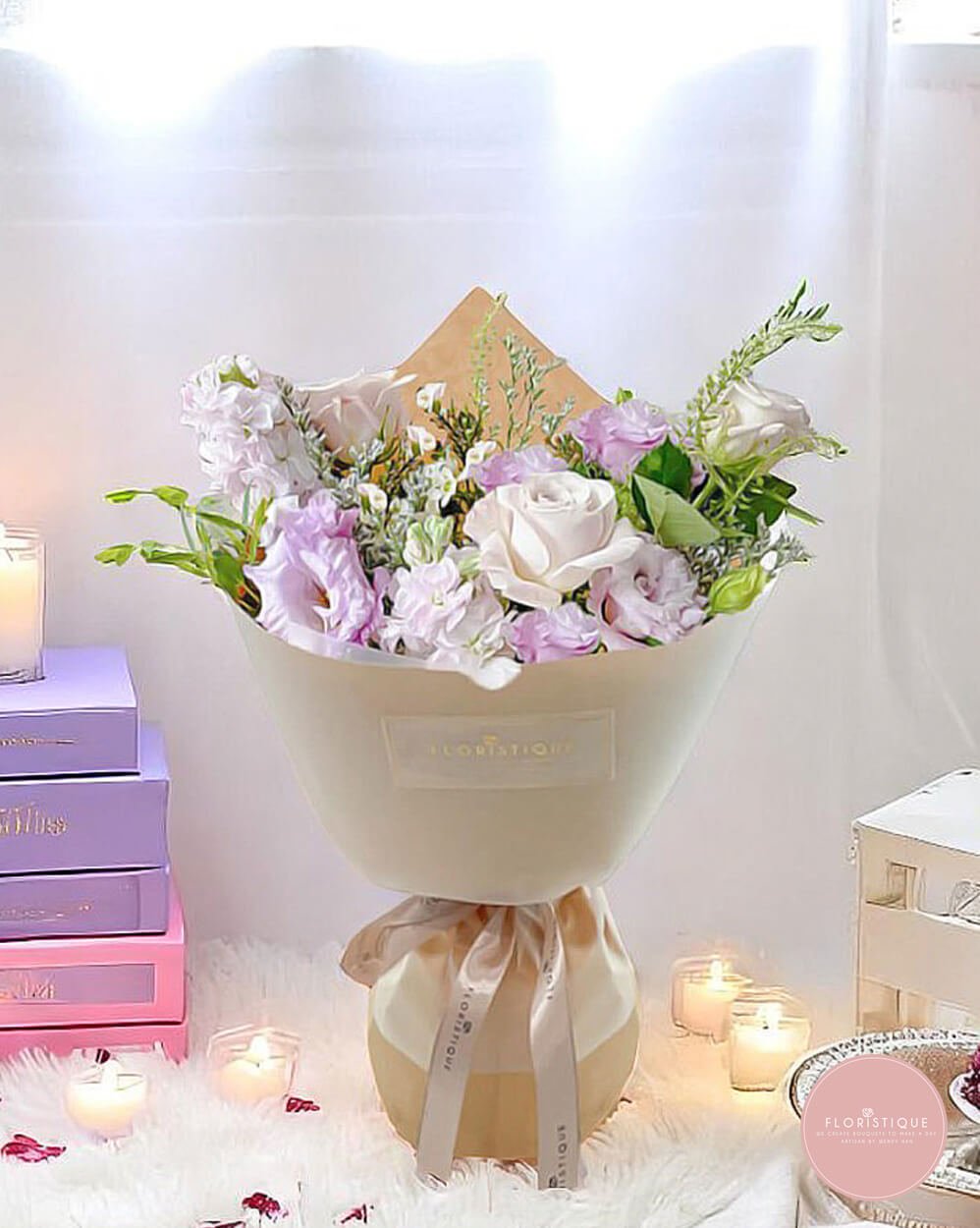 A tender ensemble of soft lilac and ivory blooms, this bouquet brings a calm, romantic elegance to any moment. Nestled in a cream-toned wrap and tied with satin ribbon, it's a graceful blend of quiet charm and heartfelt thoughtfulness.