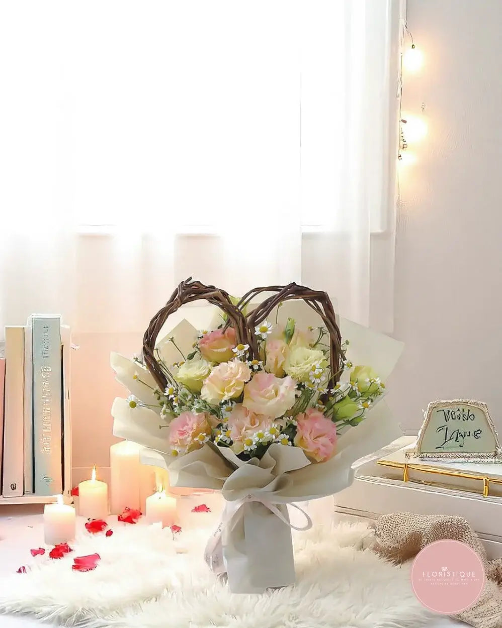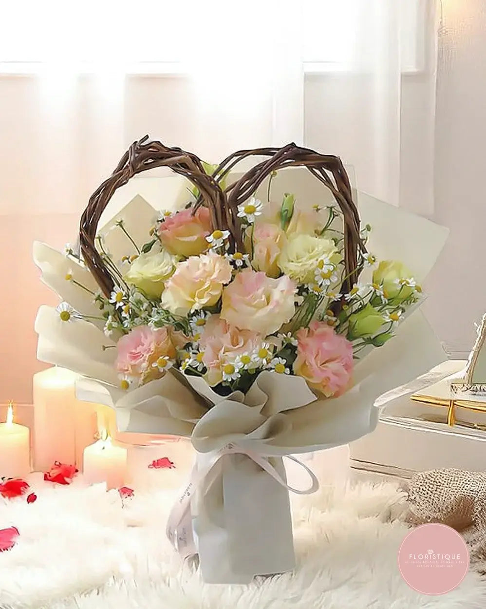 This enchanting hand-tied bouquet is arranged in a charming heart-shaped wicker basket, featuring soft blush and ivory roses, pale pink lisianthus, and delicate chamomile sprigs. Each bloom is expertly selected for its velvety petals and lasting freshness, while the rustic basket adds a sweet, heartfelt touch—perfect for anniversaries, Valentine’s Day, or telling someone just how much they mean to you.