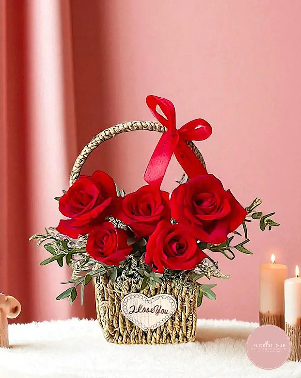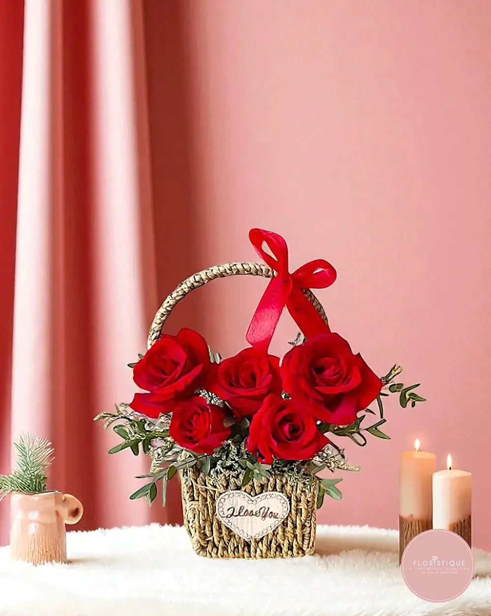 A passionate display of deep red roses arranged beautifully in a rustic woven basket, highlighted with lush greenery and finished with a bold red ribbon. This classic combination speaks of timeless love and heartfelt devotion.