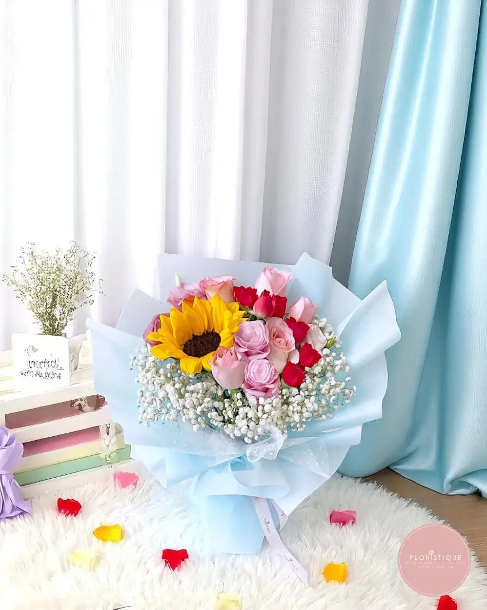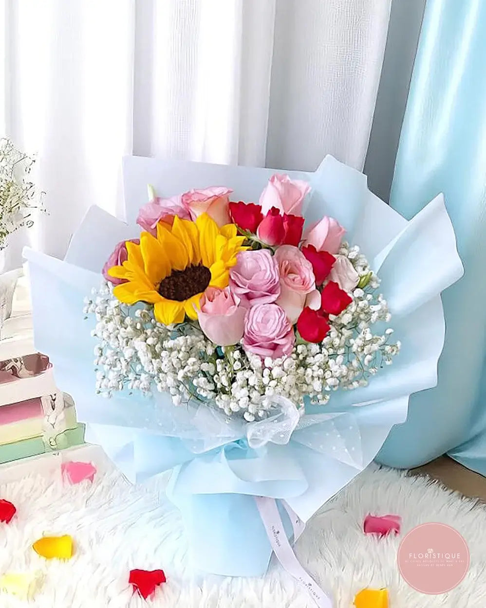A joyful blend of pastel pink and bold red roses, accented with a vibrant sunflower and delicate baby’s breath, all wrapped in soft blue. This cheerful bouquet brings warmth and positivity—perfect for birthdays, celebrations, or to simply brighten someone’s day.