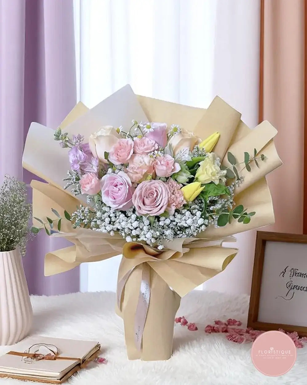 A graceful blend of blush pink roses, soft lilac blooms, creamy carnations, and cheerful yellow tulips, gently accented with baby’s breath and eucalyptus. Wrapped in warm kraft tones and finished with a satin ribbon, this bouquet radiates tenderness and charm — perfect for birthdays, anniversaries, or heartfelt surprises.