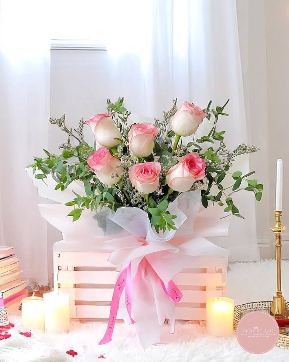 Gracefully elegant, this bouquet showcases six soft cream roses kissed with blush pink tips, delicately framed by lush greenery and misty fillers. Wrapped in layers of white and blush with a satin pink ribbon, it radiates femininity and timeless charm.