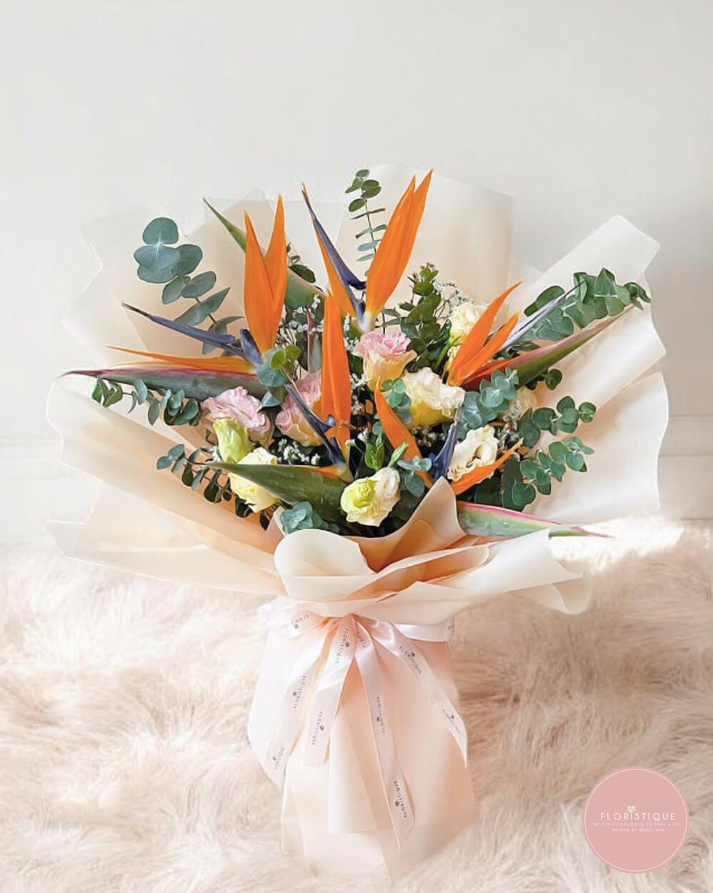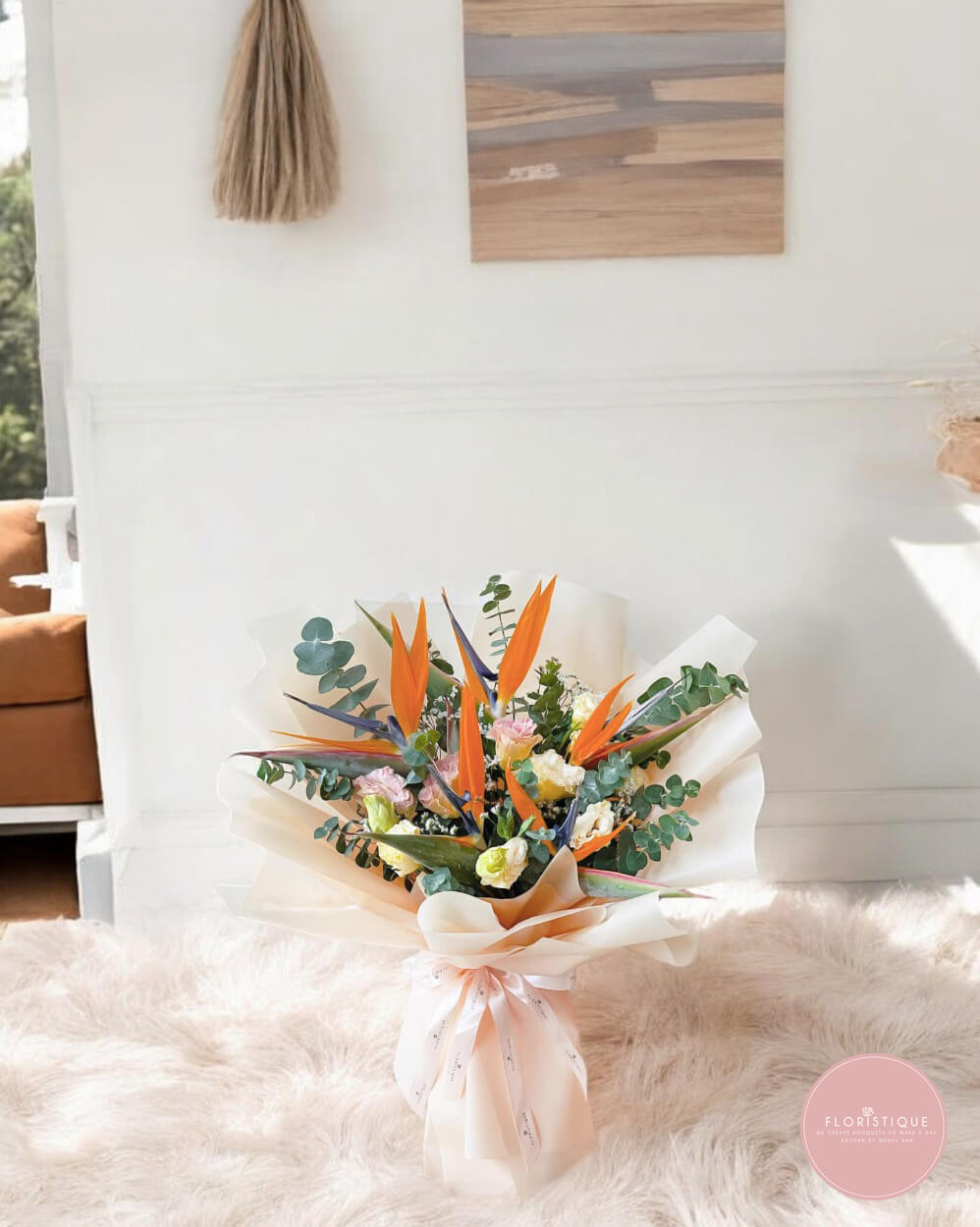 This striking hand bouquet showcases bold Bird of Paradise blooms in vibrant orange and deep blue, artfully paired with soft pastel roses and fresh eucalyptus foliage. Wrapped in warm ivory layers and finished with a flowing ribbon, the arrangement exudes confidence, creativity, and modern elegance—perfect for grand openings, celebrations, achievements, or gifting someone who loves something truly distinctive.