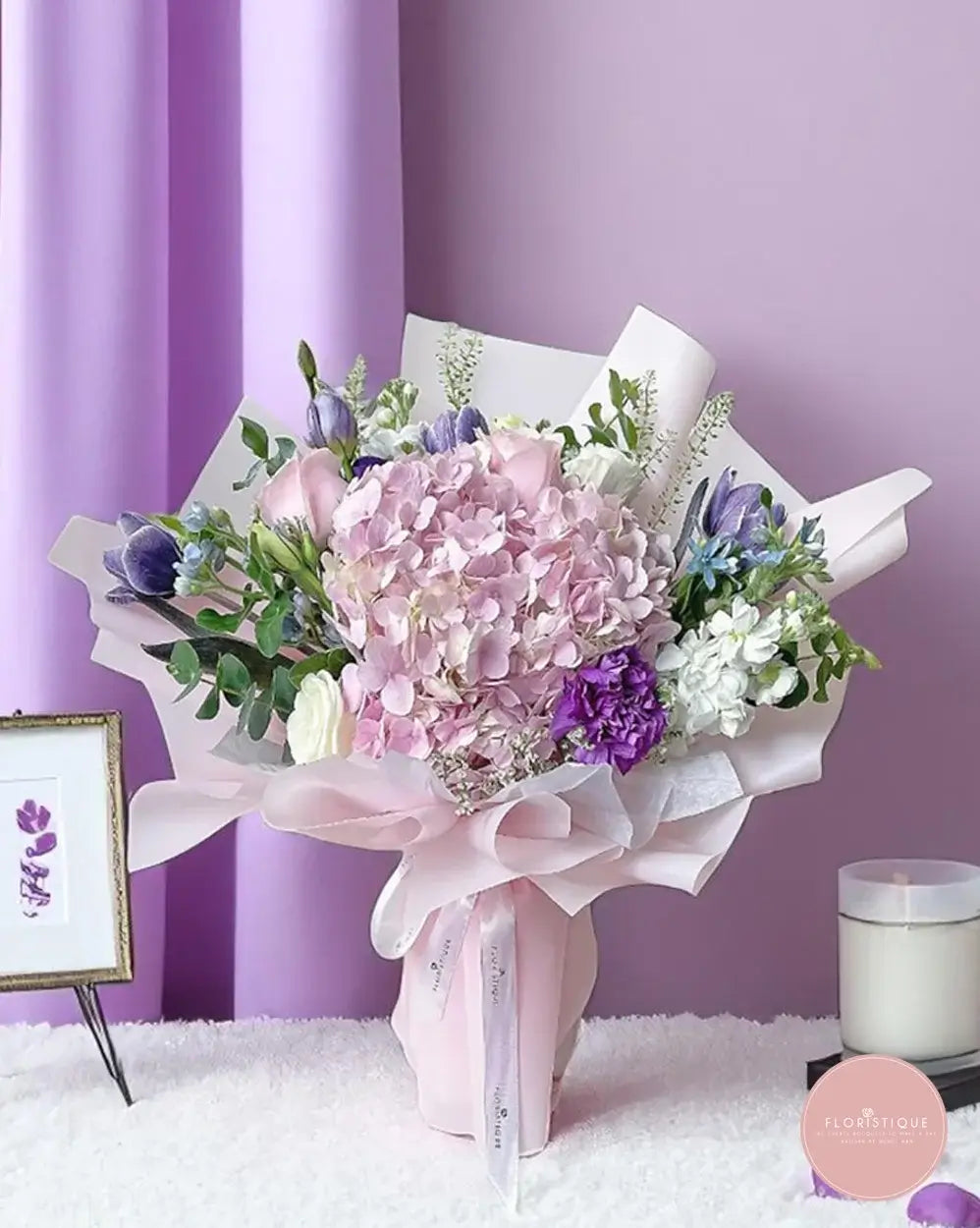 A graceful blend of soft lilac hydrangeas, blush roses, white stock, and vibrant purple fillers, beautifully wrapped in pastel pink with a sheer ribbon finish. This sophisticated bouquet brings together romance and serenity — perfect for birthdays, anniversaries, or elegant gifting.