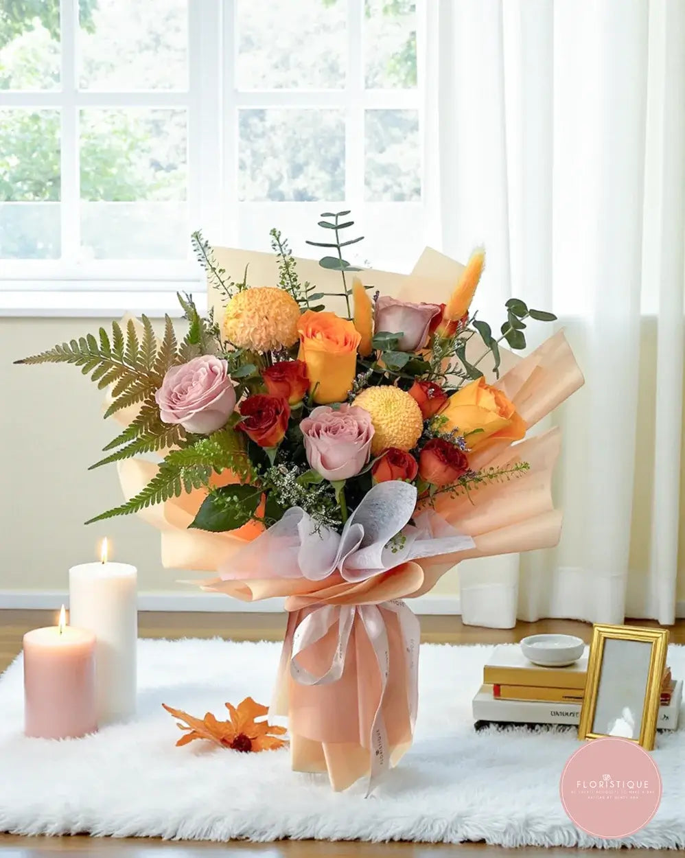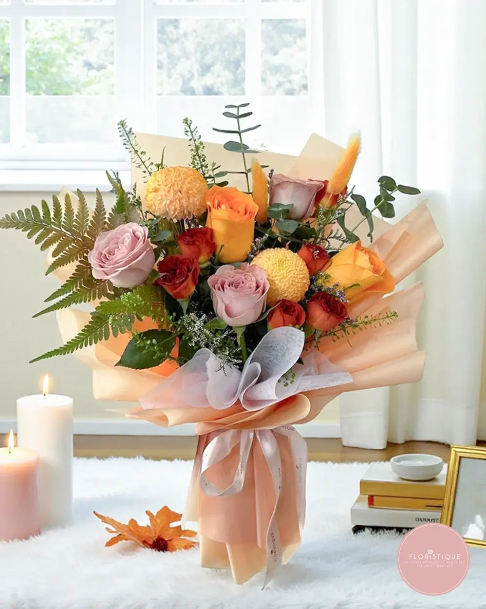 Warm and earthy in tone, this bouquet features a rich mix of golden yellow and burnt orange roses, blush-toned blooms and textured accents, paired with lush greenery and fern foliage. Wrapped in soft nude and peach layers and finished with an elegant ribbon, it carries a cosy, refined charm that feels natural and uplifting.