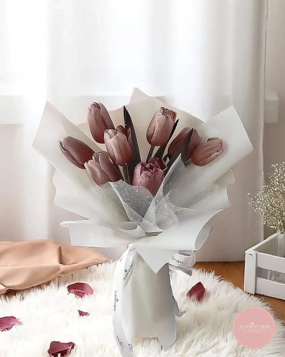 This graceful tulip bouquet features soft mauve tulips wrapped in crisp white paper and finished with satin ribbon—perfect for birthdays, anniversaries, or simply to show you care. Its muted tones bring a touch of quiet elegance to any occasion.