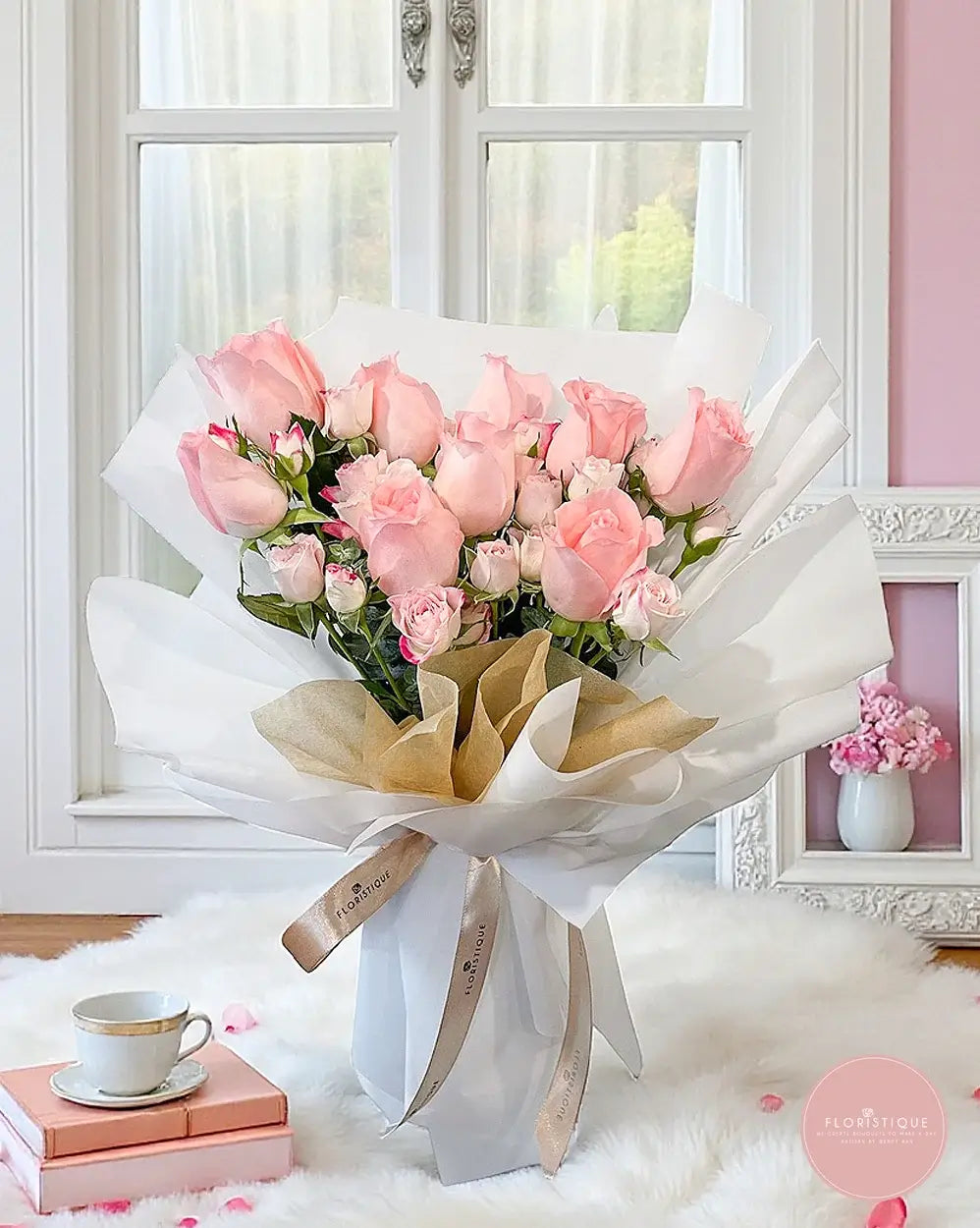 Soft and romantic, this bouquet showcases an elegant arrangement of pastel pink roses paired with dainty pink tip spray roses, wrapped in classic white with a touch of gold. Perfect for anniversaries, birthdays, or simply to brighten someone’s day, it radiates sweetness and timeless charm.