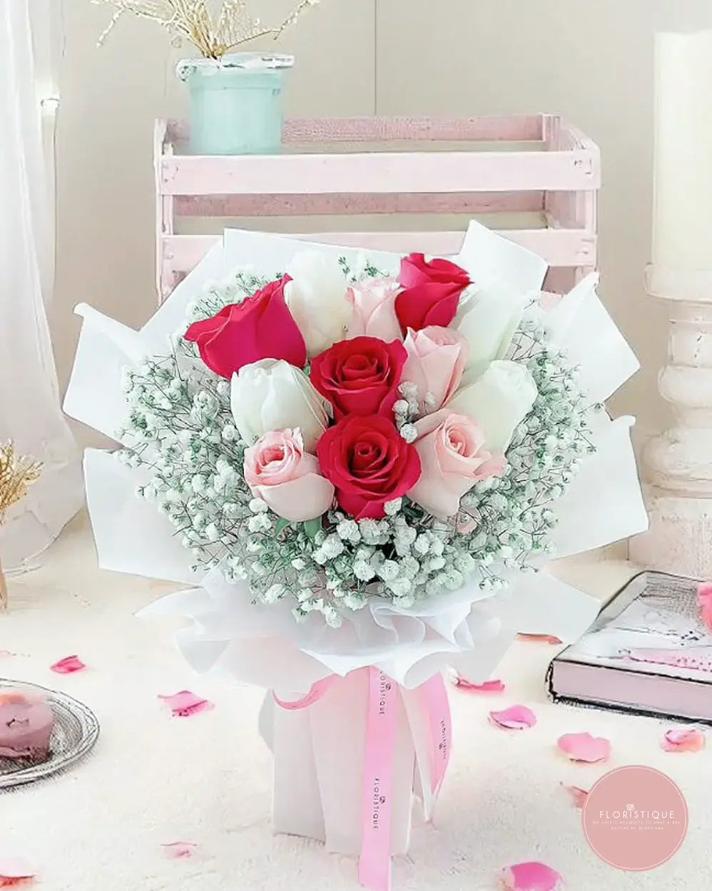 A sweet hand-tied arrangement featuring a charming mix of hot pink, soft pink, and pristine white roses nestled in a cloud of delicate baby’s breath. Each rose is hand-selected for its velvety petals and lasting freshness, creating a romantic display that’s perfect for birthdays, anniversaries, or simply brightening someone’s day.