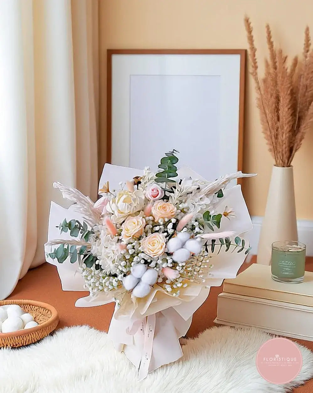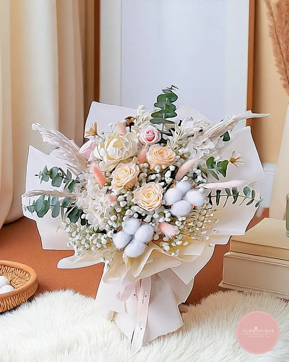 This ethereal bouquet blends soft pampas grass, fluffy cotton flowers, delicate champagne roses, and baby’s breath, creating a dreamy arrangement that exudes grace and tranquility.