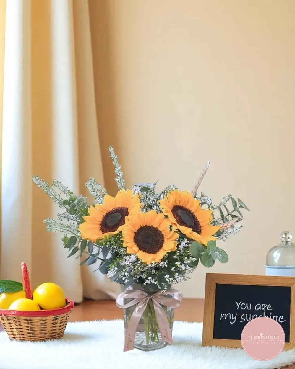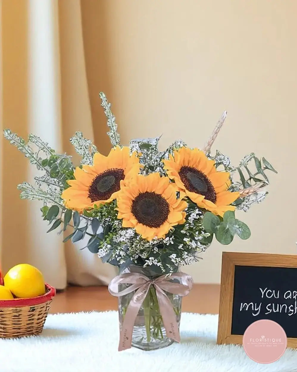 This sunny trio of vibrant sunflowers is beautifully nestled among soft white fillers and fresh eucalyptus, creating a rustic yet uplifting display. Housed in a clear glass vase and tied with a satin ribbon, it brings a touch of warmth and brightness to any space.