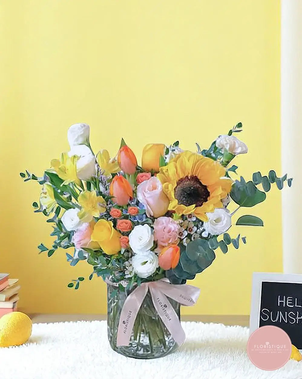 Radiating warmth and joy, this vibrant vase arrangement showcases a bold sunflower surrounded by cheerful tulips, ranunculus, roses, freesia, and daisies. The mix of yellow, orange, and soft peach blooms creates a lively yet balanced display, complemented by fresh eucalyptus greens.
