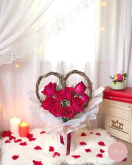 Celebrate love in its purest form with this striking bouquet of red roses, elegantly framed within a handcrafted heart-shaped vine. Each velvety bloom is carefully arranged and wrapped in soft blush tones, finished with deep red satin ribbon for a dramatic romantic flair.