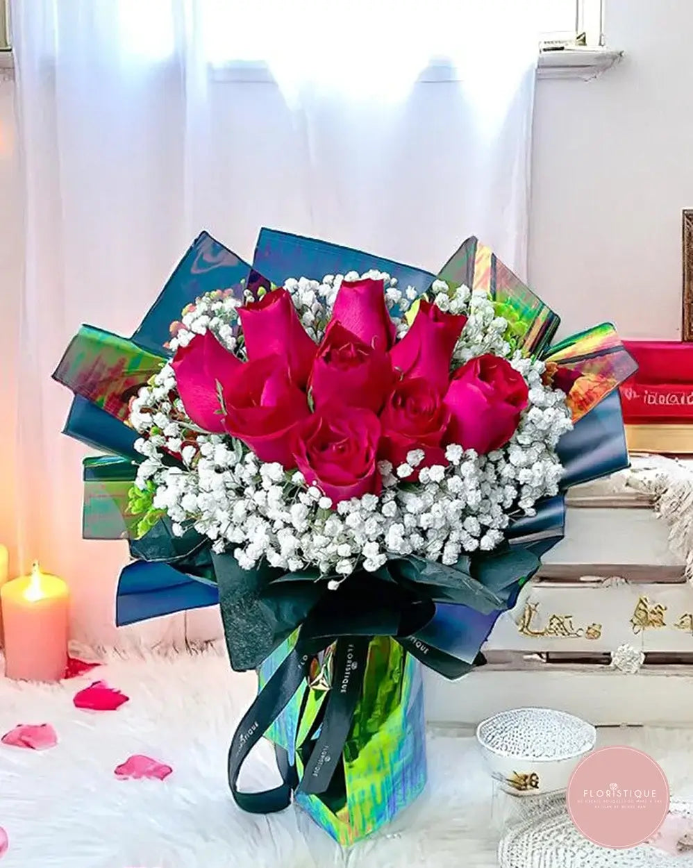 Rich red roses bloom beautifully from a soft cloud of delicate baby’s breath, wrapped in shimmering iridescent layers that reflect light with every movement. The striking contrast between deep crimson blooms and luminous wrapping creates a look that feels bold, passionate and irresistibly romantic.