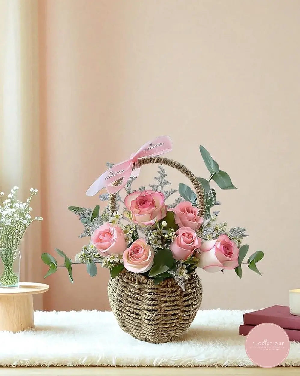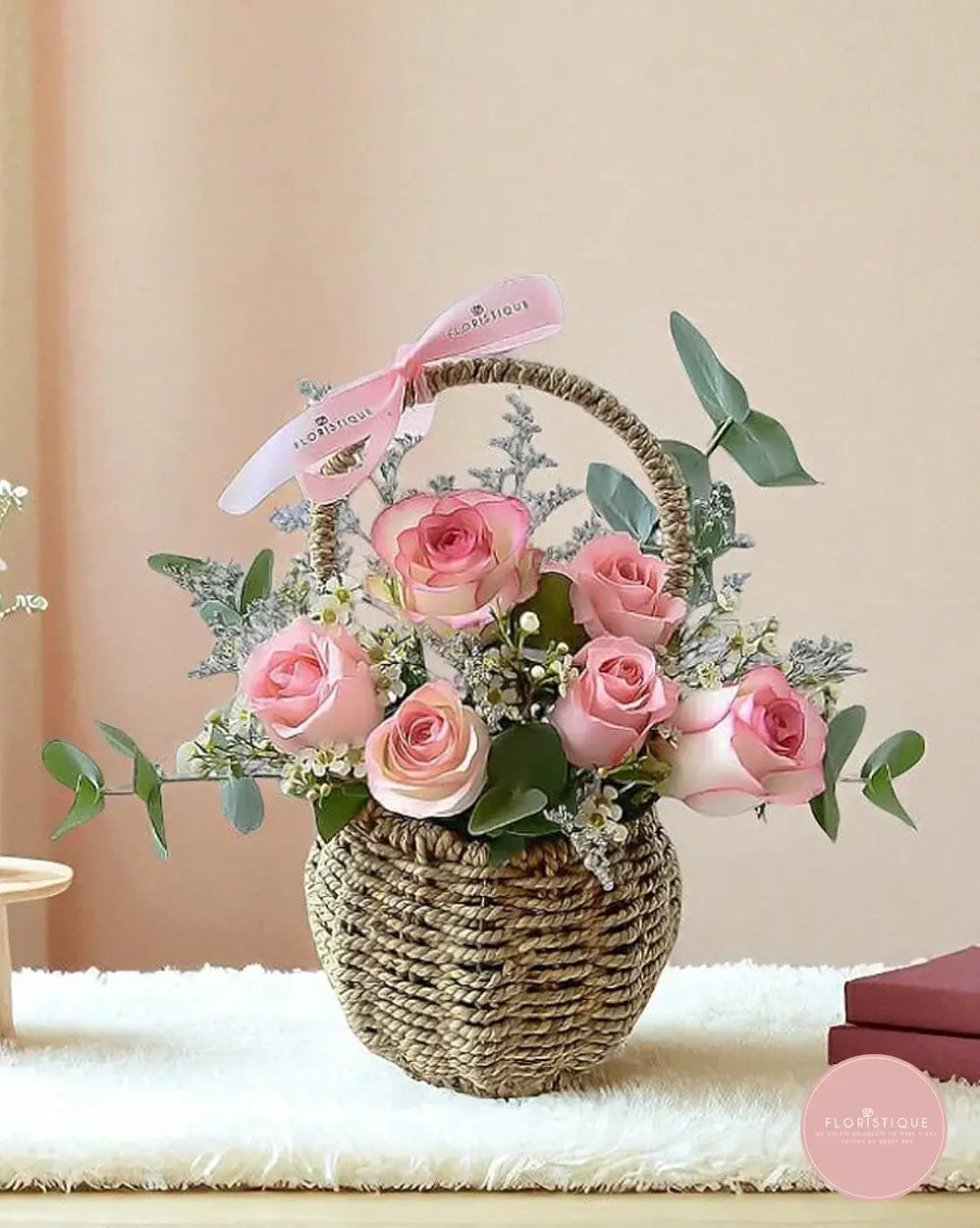 Soft pink roses are delicately arranged in a charming woven basket, accented with fresh greenery and finished with a gentle ribbon detail. The natural textures and tender blush tones create a cosy, romantic feel that’s sweet, thoughtful and effortlessly heartfelt.