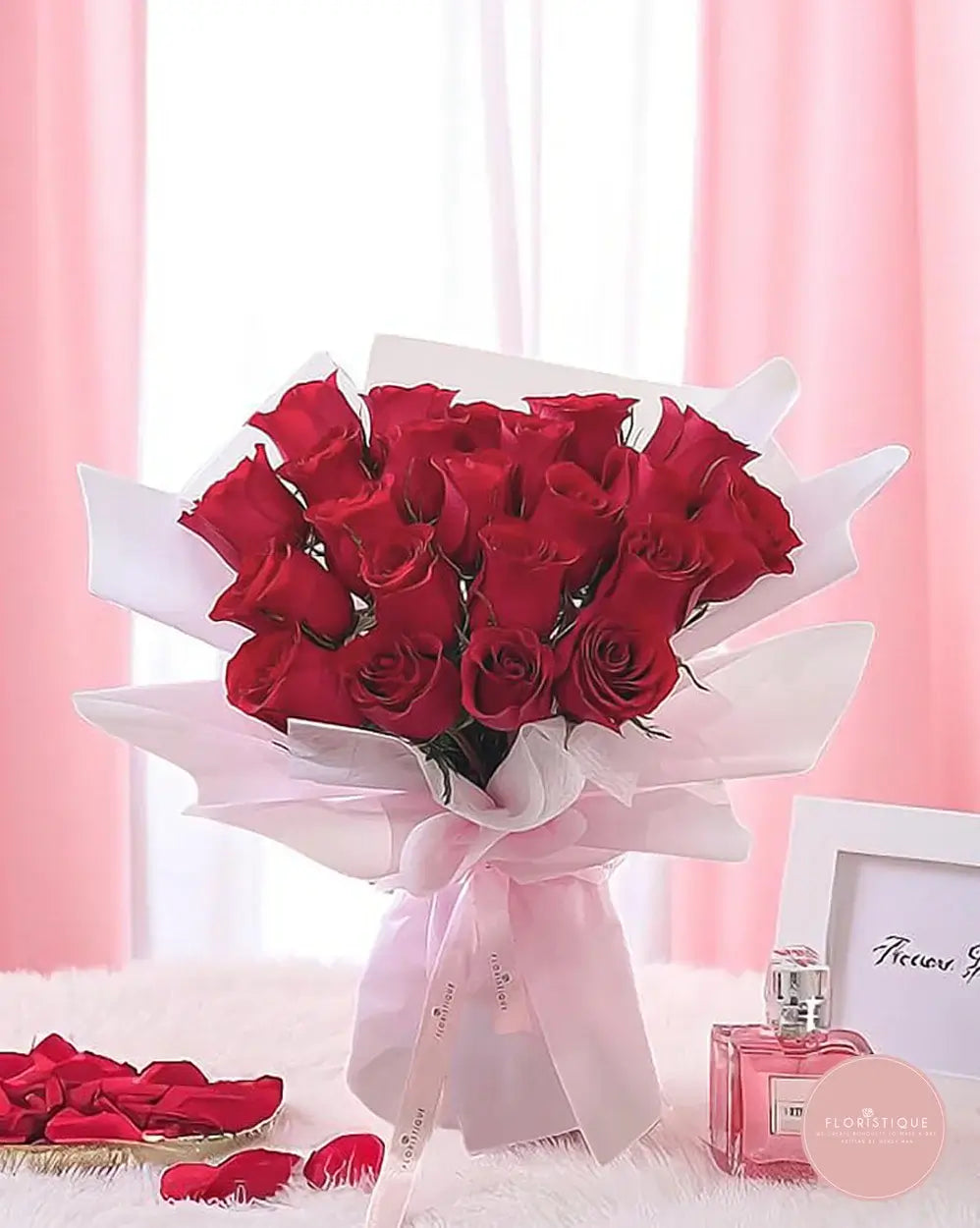Bold, luxurious and breathtaking, this statement bouquet features twenty-two premium red roses, hand-selected for their deep crimson hue and full, velvety petals. Lavishly arranged and wrapped in soft, elegant layers, it creates an unforgettable expression of passion and devotion that feels rich in both beauty and emotion.