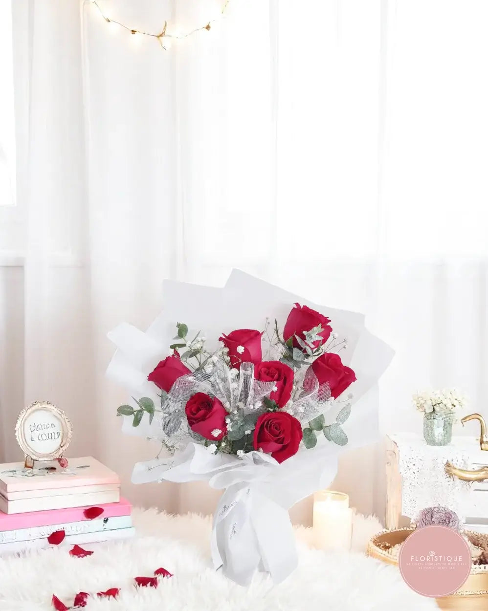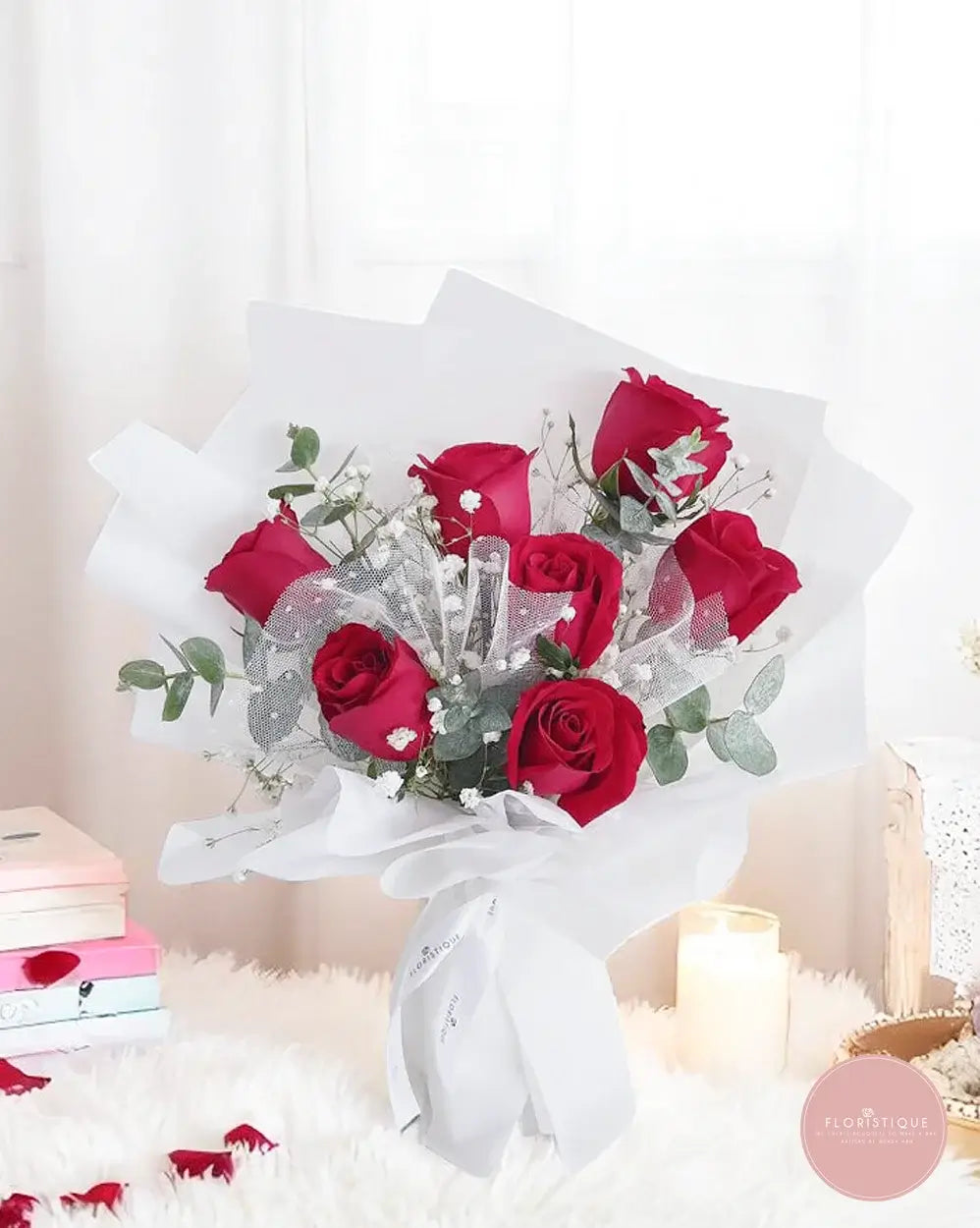 Elegant red roses bloom gracefully among fresh greenery, wrapped in soft white layers that highlight their rich colour and timeless beauty. The clean, refined presentation gives this bouquet a romantic charm that feels sincere, classic and effortlessly meaningful.