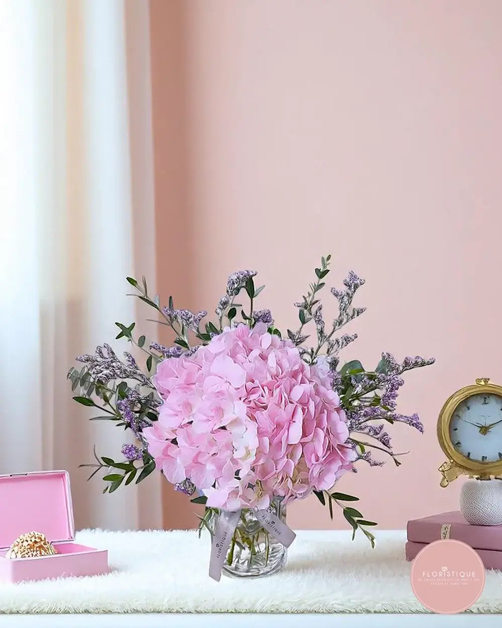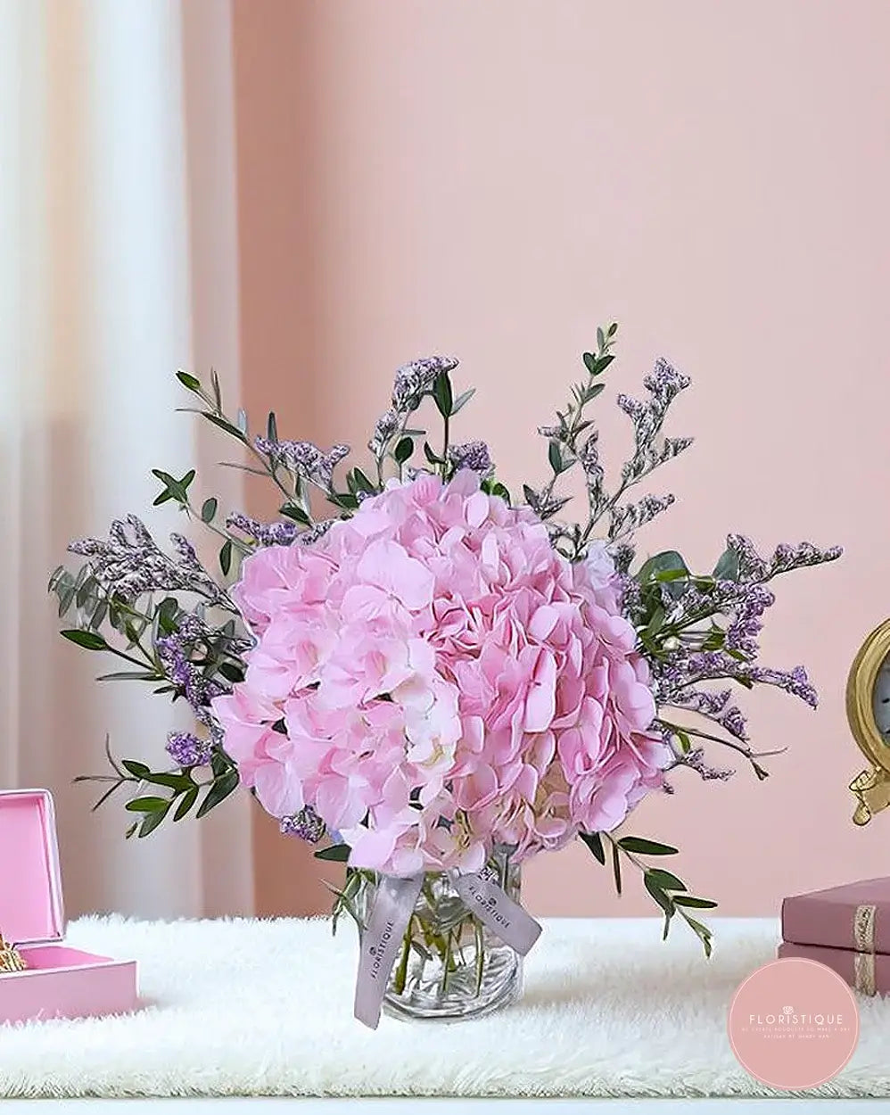This charming vase arrangement features a generous cluster of pink hydrangeas, accented with sprigs of limonium and lush greenery. Its soft pastel palette brings a gentle, romantic feel—perfect for anniversaries, heartfelt thank yous, or sending love and encouragement.