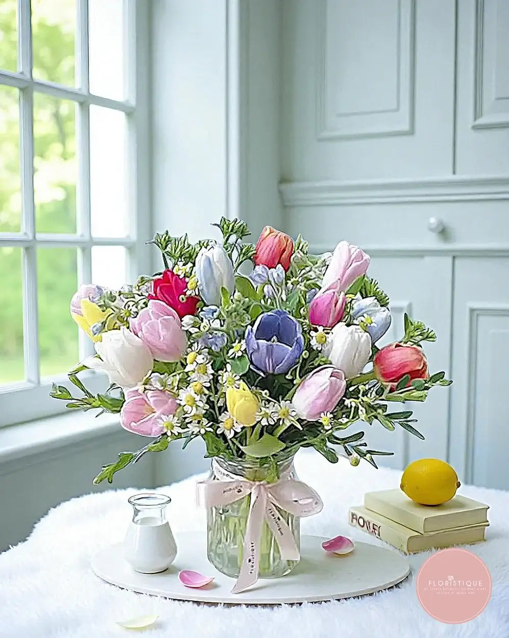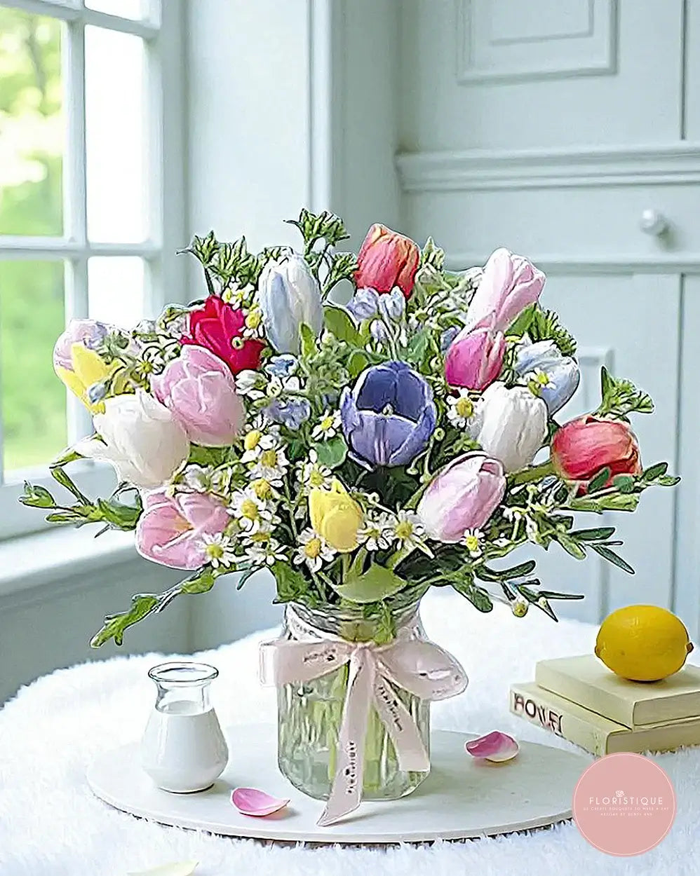 Brimming with soft pastel tulips in hues of lavender, blush, lemon, and coral, this enchanting vase arrangement captures the gentle joy of springtime. Accented with delicate chamomile blooms and fresh greenery, it evokes a serene garden scene in full bloom—perfect for brightening someone’s day.