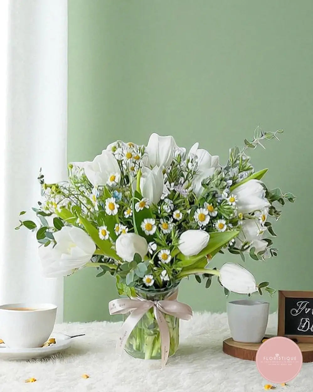 This elegant vase arrangement showcases pristine white tulips paired with cheerful chamomile blooms and lush greenery. The simplicity of the tulips exudes grace and purity, while the chamomile adds a soft, countryside charm to the ensemble.