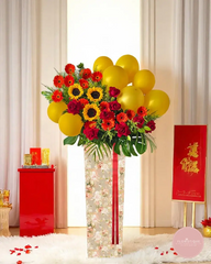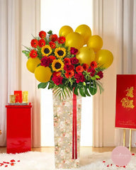 Elevate grand openings with the Golden Jubilee Stand—a vibrant celebration of success, love, and prosperity. This striking arrangement features a jubilant blend of orange gerberas, red roses, and bright sunflowers, artfully paired with golden balloons for a festive touch. Designed to turn heads and mark milestones, this sunflower and red rose flower stand sets the perfect tone for any business launch or celebratory occasion.
