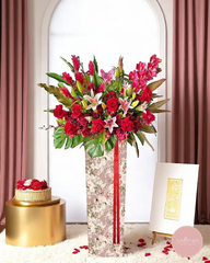 Ignite opulence with our Opulent Red Floral Stand, crafted to transform any business opening into a grand celebration. This luxurious arrangement features towering pink lilies, vibrant red roses, delicate orchids, and exotic red ginger flowers—each bloom symbolizing passion, elegance, and prosperity. Set against the richness of wavy red velvet skirting, it forms a bold and sophisticated centerpiece that commands attention and admiration.