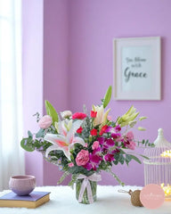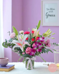 This elegant vase arrangement showcases the exotic beauty of orchids and stargazer lilies, balanced with soft pink roses, carnations, and pastel fillers. Lush greenery completes the ensemble, creating a radiant and uplifting floral display that celebrates life’s special moments.
