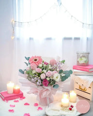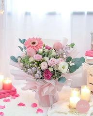 This enchanting bouquet is a symphony of soft pink hues, featuring delicate roses, charming gerberas, beautifully arranged with eucalyptus foliage. Wrapped in elegant pastel tones, this arrangement exudes romance and grace, making it a perfect choice for special occasions or heartfelt gestures.