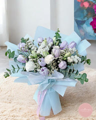 Experience serenity with our Purple Tulip & White Eustoma Bouquet — a stunning arrangement featuring delicate dyed purple tulips and white eustomas, accented by lush greenery and sprigs of baby's breath. Elegantly wrapped in soft blue paper, this bouquet embodies tranquility and elegance, perfect for any occasion. Place your orders now with a trusted florist in Singapore and enjoy free flower delivery across the island.