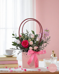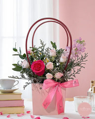 A delightful bag arrangement featuring a vibrant hot pink rose, soft pastel spray roses, dainty chamomile, and delicate filler flowers, all presented in a chic pink bag with double red handles and finished with a matching ribbon. The playful mix of bright and pastel tones creates a charming gift that radiates joy and affection.