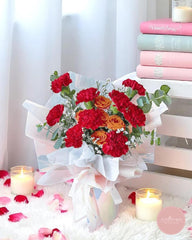 Express passion with our Red Carnation & Orange Spray Rose Bouquet — a dazzling arrangement featuring nine vibrant red carnations and the radiant charm of orange spray roses. This bouquet symbolizes love, passion, and enthusiasm. The rich red and warm orange hues create a stunning contrast, making it an ideal gift to express heartfelt emotions and celebrate special occasions with flair. Place your orders now with a trusted florist in Singapore and enjoy free flower delivery across the island.