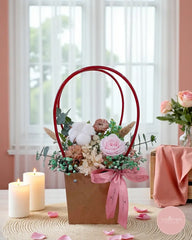 A sweet and timeless preserved floral arrangement designed to last beautifully for months. Featuring a soft blush pink preserved rose paired with fluffy cotton blooms, beige hydrangea, rustic wheat stalks, and dainty green-tinted baby’s breath, all accented with sprigs of eucalyptus. Presented in a kraft bag with rich red handles and tied with a matching pink satin ribbon, it’s the perfect blend of elegance and charm.