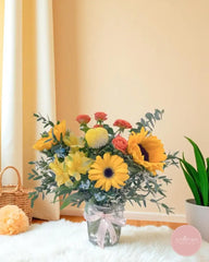 A burst of sunshine in a jar, this vibrant vase arrangement features golden sunflowers, bright yellow gerberas, coral spray roses, and cheerful alstroemeria. Accented with eucalyptus and seasonal fillers, it brings an energizing touch to any room or celebration.