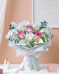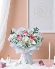 This elegant bouquet brings together the pure beauty of white calla lilies with delicate pink and cream roses, accented by fresh eucalyptus. Wrapped in soft white tones, it’s a refined expression of love, gratitude, or celebration.