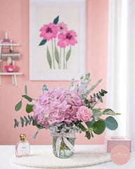 This delightful vase arrangement features a blend of cheerful pink hydrangeas, soft carnation, pale larkspur, and dainty fillers, accented with fresh eucalyptus for a refreshing finish. Neatly arranged in a clear glass jar and tied with a satin ribbon, it's a charming gift for any celebration or table display.