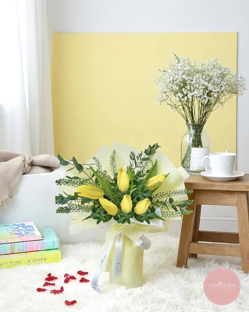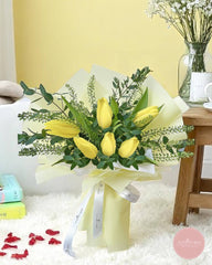 Bright and full of cheer, this bouquet features seven vibrant yellow tulips surrounded by lush greenery and fresh foliage. Wrapped in soft yellow and white layers with a satin ribbon, it brings a burst of sunshine to any moment.