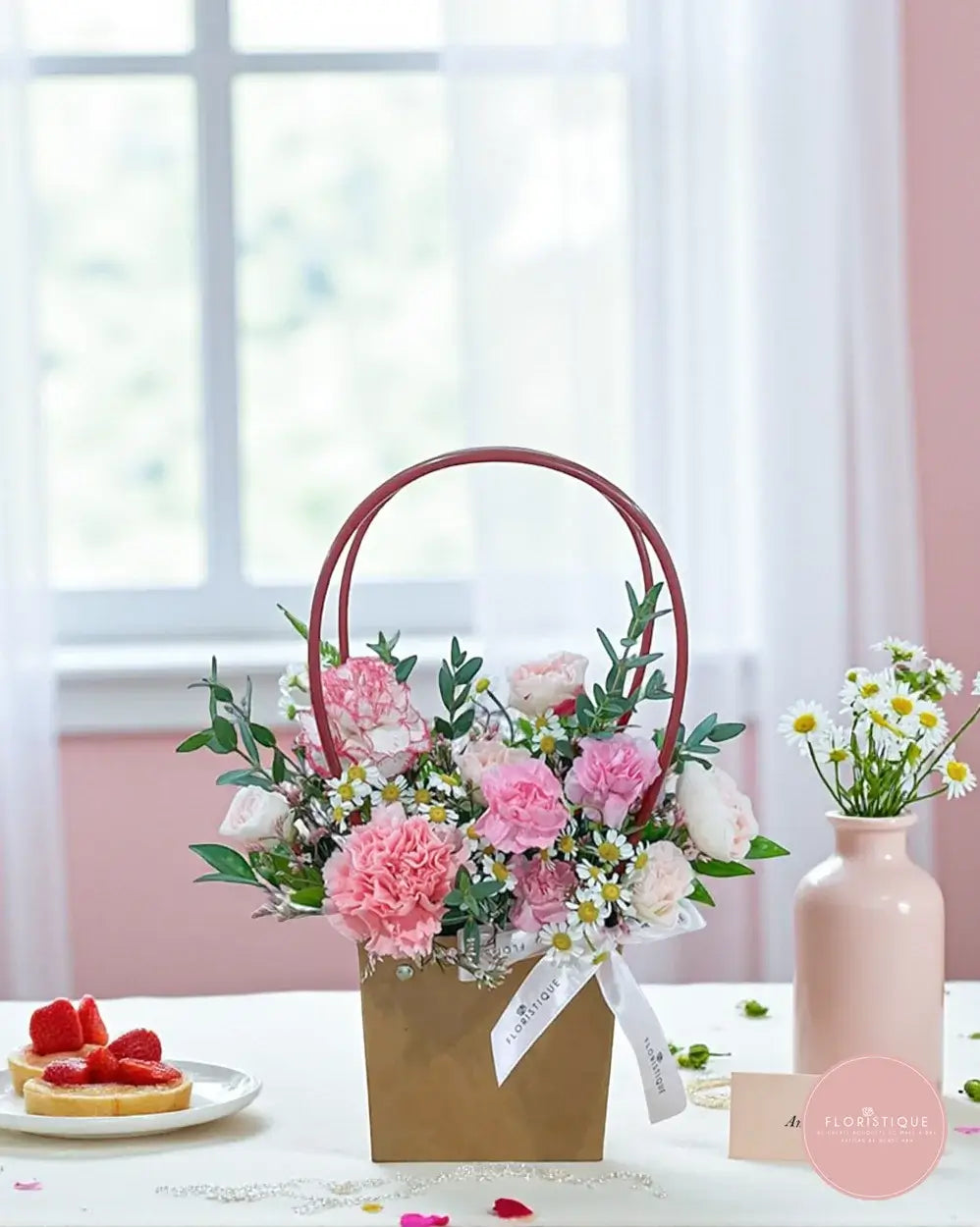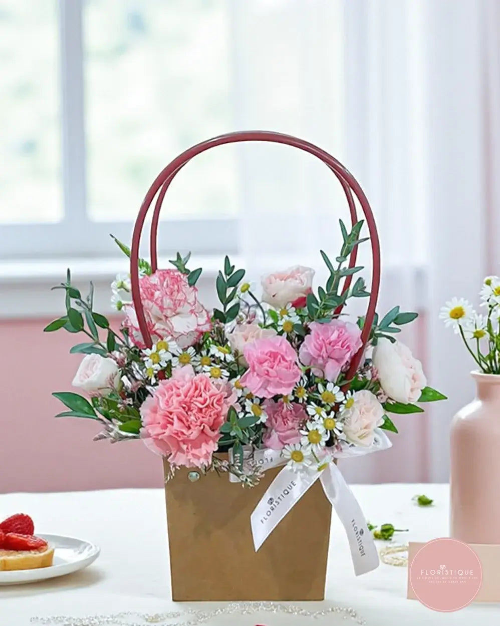 Soft and cheerful, this bloom bag features a heartwarming mix of pink carnations, spray roses, chamomile daisies, and blush-toned roses. Set in a kraft-style bag with a sturdy red handle and finished with an elegant satin ribbon, it’s the perfect pick for someone who loves classic pink florals with a fresh garden touch.