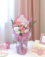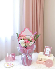 A graceful blend of soft pink roses, creamy white eustoma, and elegant pink carnations, this bouquet exudes tenderness and charm. Nestled in a chic pink wrapper and accented with sprigs of greenery, it’s the perfect gesture to celebrate love, gratitude, or heartfelt affection.