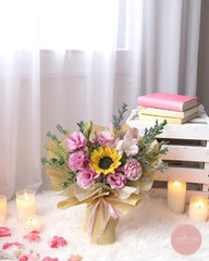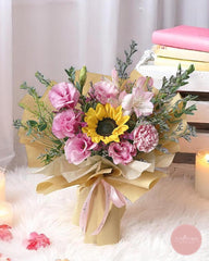 Radiating charm and warmth, this cheerful bouquet features a stunning sunflower as its centerpiece, beautifully framed by delicate pink lisianthus, alstroemeria, carnation, and sprigs of greenery. Wrapped in earthy kraft tones with a soft pink ribbon, it’s a heartwarming gesture perfect for birthdays, congratulations, or just because.